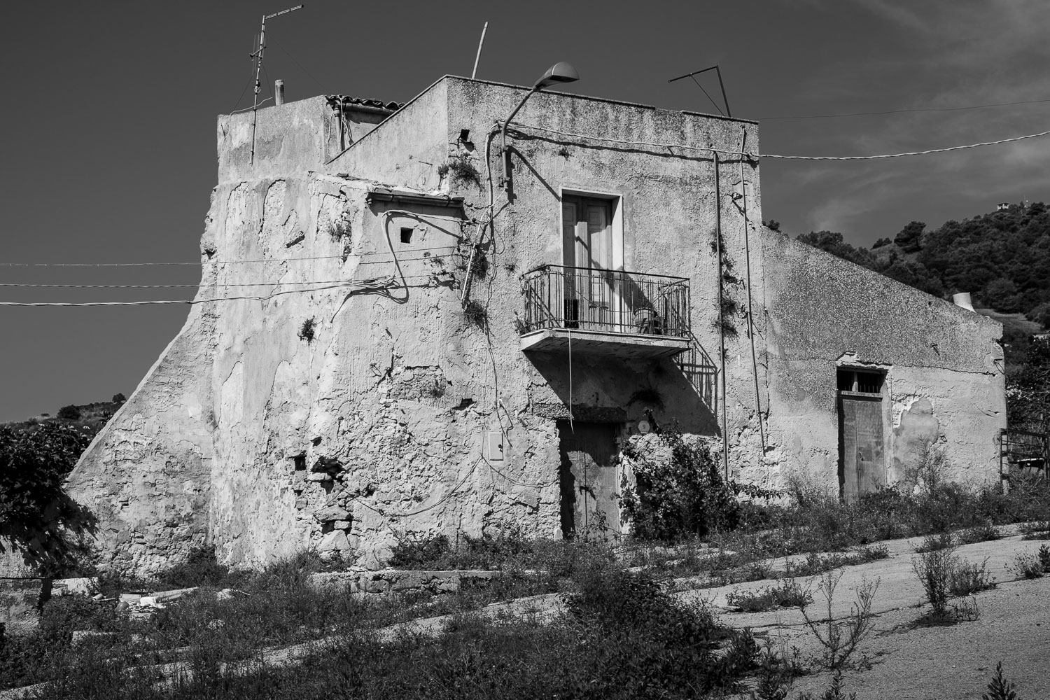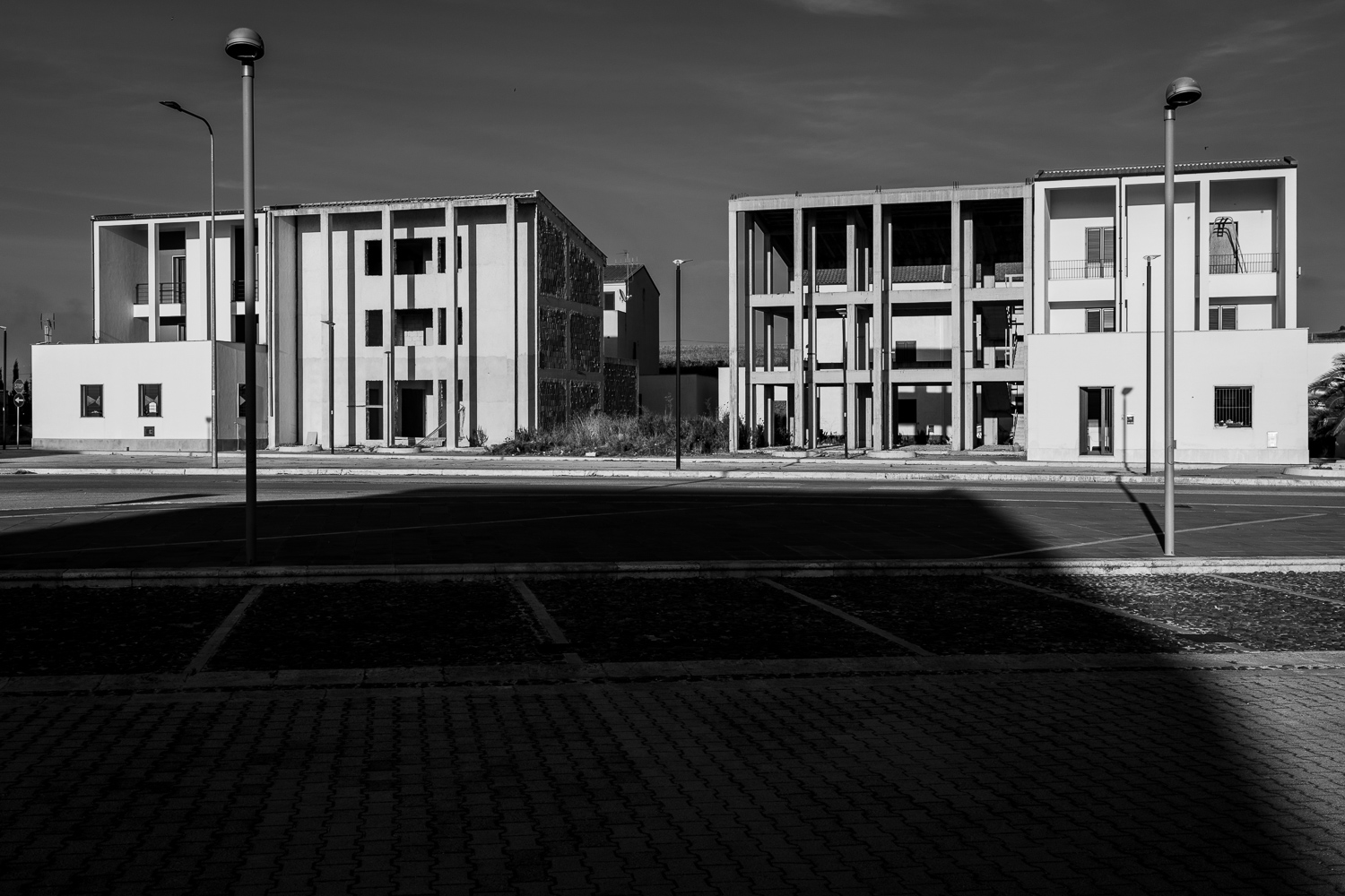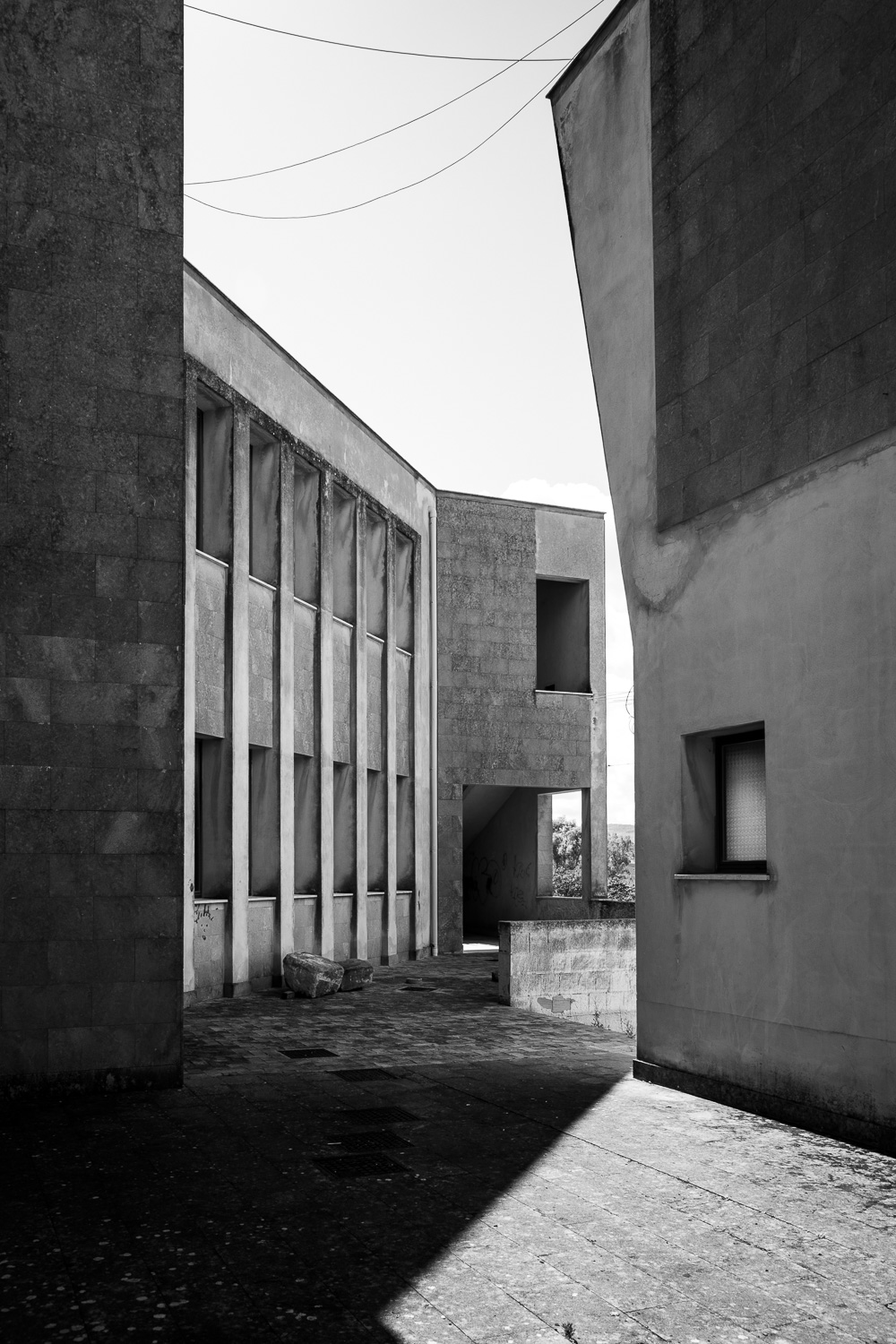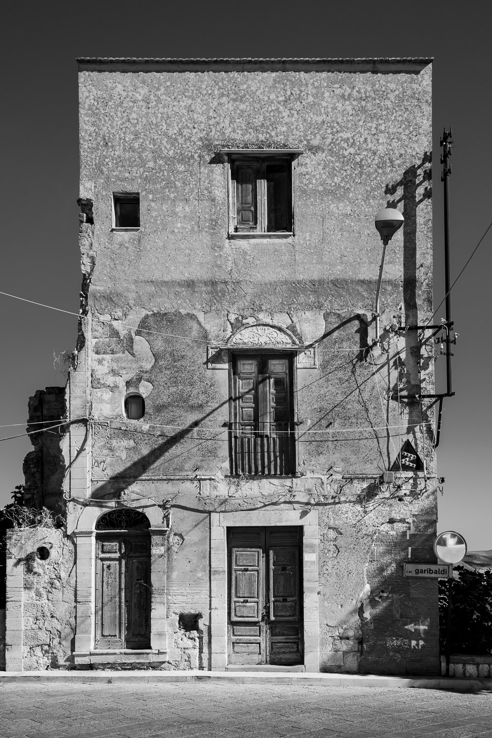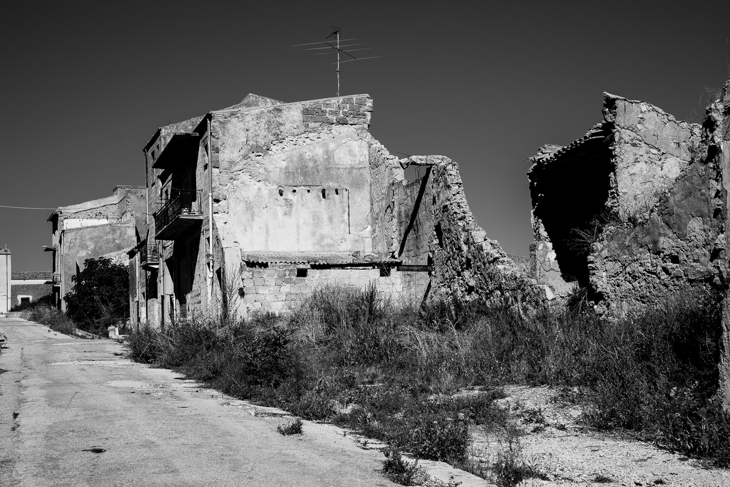 Fifty years ago a major earthquake destroyed most of the villages in the Belice valley in southwestern Sicily. In some villages a few houses have been reconstructed for some inhabitants to return, but even today large parts of these villages are still in ruins and mostly deserted, so they appear like ghost towns. Some other villages have been relocated to another place nearby and newly rebuilt from scratch in a postmodern or brutalist design, but they often remain unfinished. Over the years their unneighbourly habitats have also been deserted particularly by the younger generation and they thus equally appear like ghost towns of a different kind.